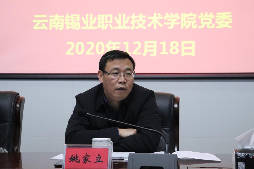 12月18日,云锡控股公司党委副书记、工会主席姚家立率调研组到云锡职院调研2020年度基层党建工作,希望学院党委聚焦立德树人根本任务,加强和改进党的建设,把党的领导贯穿办学治校、教书育人全过程,履行好管党治党、办学治校主体责任,党建引航,铸魂育人。