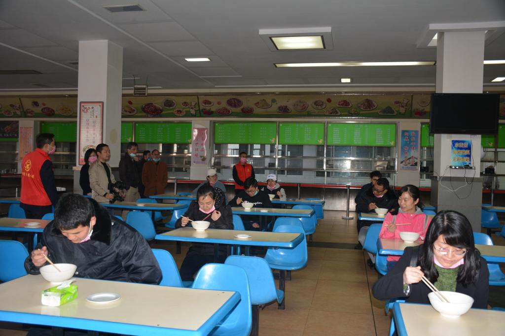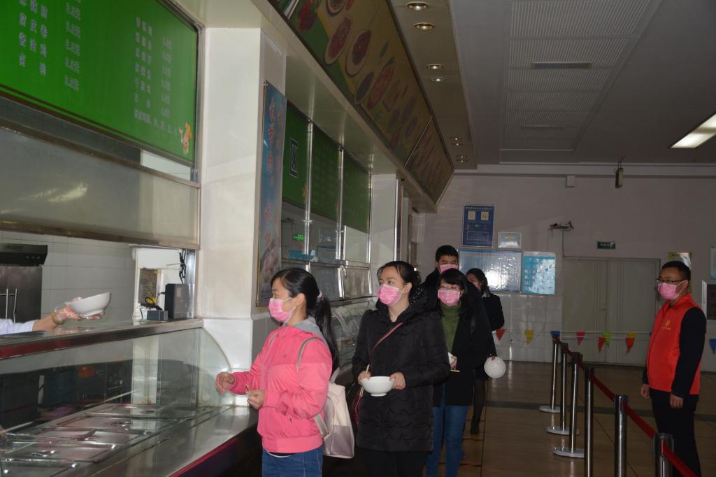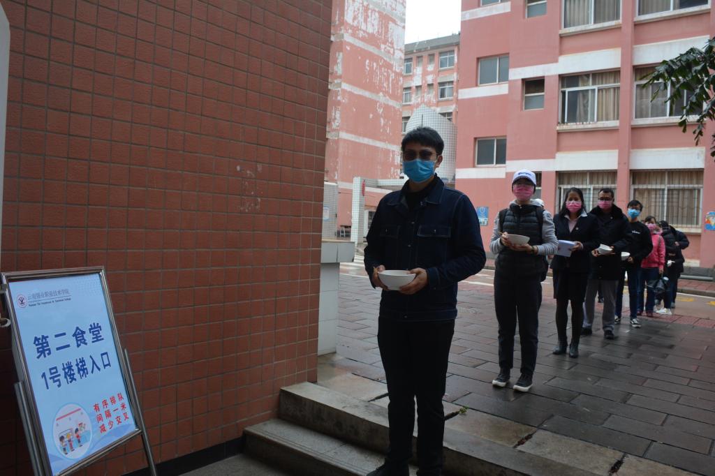 演练场景三模拟学生返校后到食堂如何错峰就餐。演练人员在学院志愿者的指引下沿着路线图进行演练。在所有食堂,按照“防控指南”的要求,标注了指引路线、就餐位置、排队等候标识等,参加演练的“学生”分批分段,排队等候,有序取餐。精准的措施,有效保障了演练顺利进行。