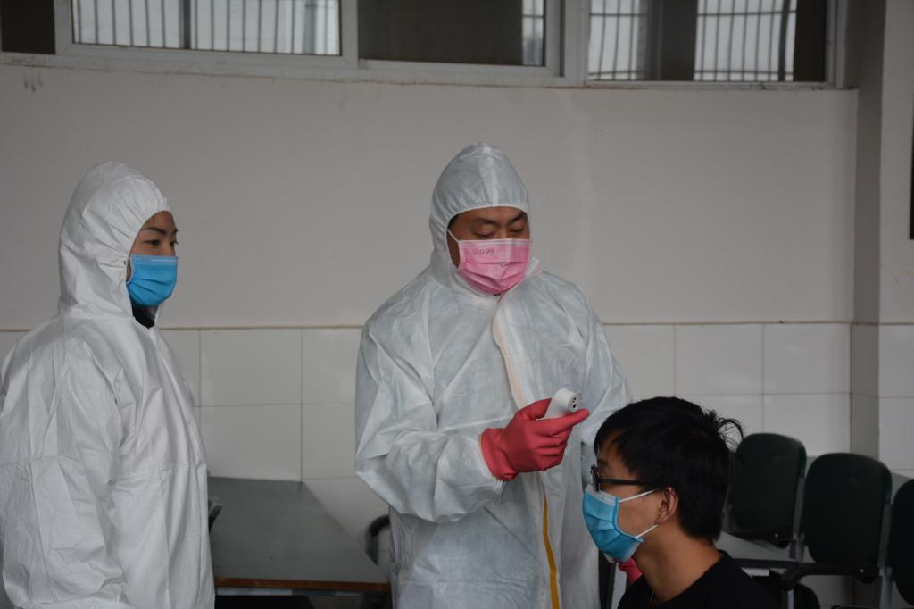 演练场景二模拟学生返校后到3号教学楼上课过程中,出现身体不适或疑似疫情的应急处置。一名学生在上课过程中出现发热症状,学生报告老师后,老师立即报告学院疫情防控办公室,办公室迅速通知学校卫生所医务人员赶到,经测量,发现该名学生体温超过37.3℃,初步诊断为高风险情况,及时进行了确诊或疑似单发、聚集性疫情的应急处置,并对教室进行了消毒处理。