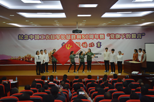 为隆重纪念中国工农红军长征胜利80周年,讴歌中国共产党为实现中华民族伟大复兴中国梦的奋斗历程和光辉业绩,充分展示职业学院广大教职员工立德树人、追求卓越、勇攀高峰的良好精神风貌。11月16日晚19:30分,由职业学院党委主办,党委宣传部、思政部、学生处和团委承办的纪念中国工农红军长征胜利80周年暨“党旗下的誓言”主题朗诵比赛在508报告厅举行。学院领导班子、助理以上管理干部、各党支部全体党员以及200多名学生观看了比赛。