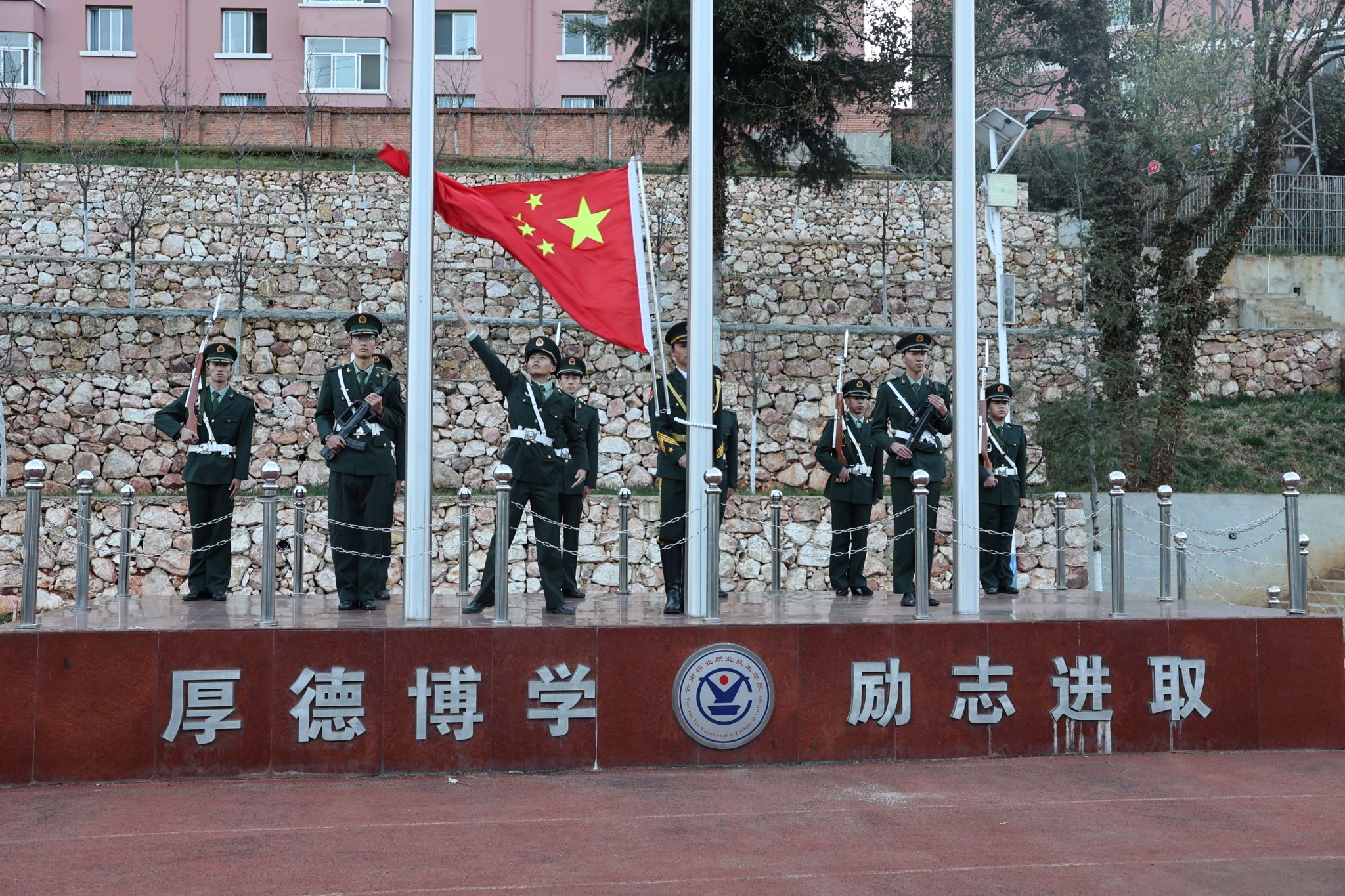 上午8时,学院国防后备连的同学迈着铿锵步伐护送国旗至升旗台。伴随着雄壮的国歌声,五星红旗冉冉升起,全体人员肃立注目,致以崇高敬意。