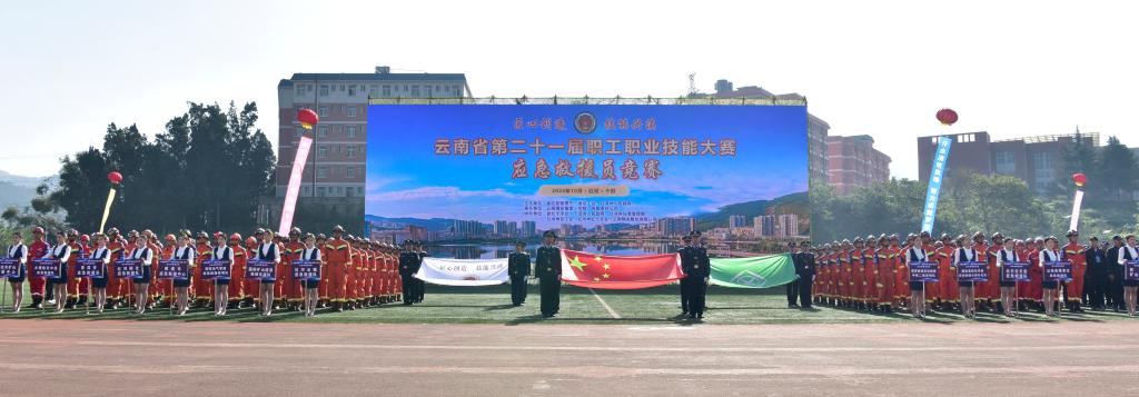 10月24日上午,伴随着雄壮的国歌声,云南省第二十一届职工职业技能大赛应急救援员竞赛在学院足球场举行。