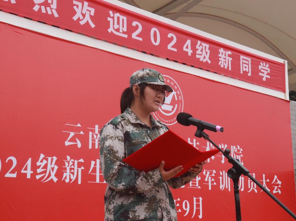 新生周倩代表24级全体新生承诺:一切行动听指挥,虚心学习,刻苦训练,严格遵守各项纪律,在军训中磨炼自我,以自信、自强、坚韧的精神风貌开启新阶段的学习生活。