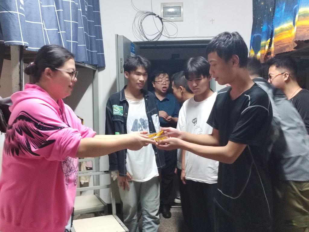 当走到各班级活动现场时,学子们以热烈掌声表示欢迎,铿锵的祝福声阵阵飘过。学院领导观看了学子们的精彩表演,并一起参与到游戏中,现场有美妙的音乐,有欢快的舞蹈,有充满童真的趣味互动······当走进学生宿舍时,学子们都礼貌地送上节日的祝福,邀请与他们一起品尝月饼、品尝瓜果,映入眼帘的就是一幅其乐融融、充满温情的画面。