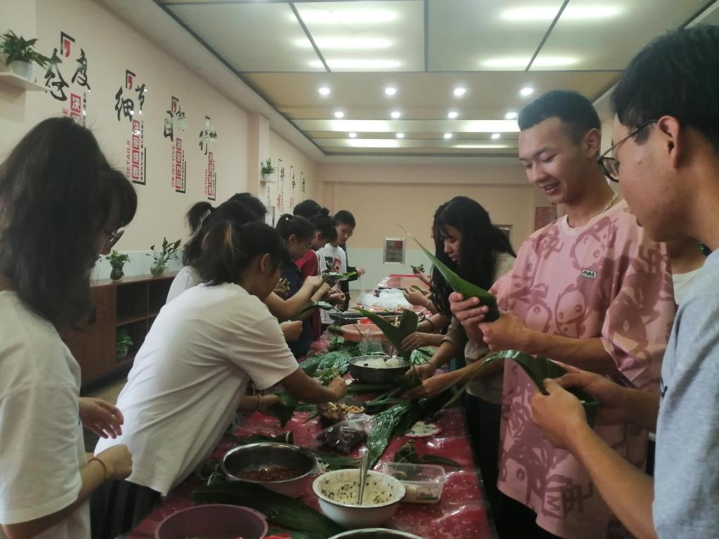 在学生食堂、教室等现场,糯米、蛋黄、蜜枣、绳、粽叶一应俱全,粽叶舞动,粽绳穿梭。李蕾带头参与了包粽子等活动,并祝愿同学们端午节快乐。