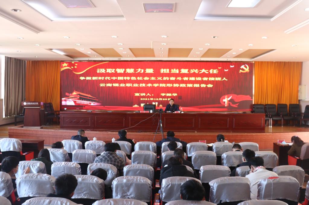 12月29日,红河州委常委、宣传部部长字振华深入学院,为学院师生作题为《汲取智慧力量 担当复兴大任 争做新时代中国特色社会主义的奋斗者建设者接班人》的形势政策报告。学院党委书记张鹏主持报告会。红河州教体局局长张学理,学院院长李蕾,副院长曲向哲、张惠芬等领导出席报告会。报告中,字振华从“深刻学习领会党的十九届六中全会精神,准确把握新时代新征程的宏大气象”、“深刻学习领会省第十一次党代会精神,准确把握云...